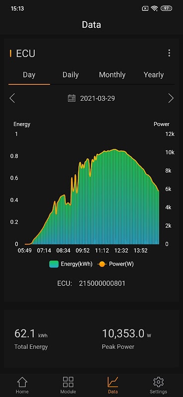 दिन, महीने, साल और सरणी के जीवनकाल से उत्पादन प्रणाली देखें, और किलोवाट प्रति घंटे की कीमत के आधार पर ऊर्जा बचत की गणना।
