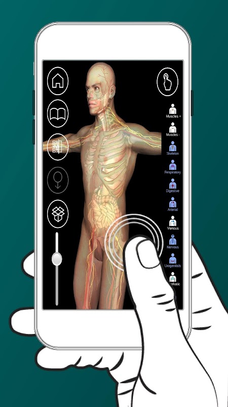 Приложение содержит разделы: мозг, сердце, дыхательная система, система внутренних органов, рука и запястье, зубная система, бедро, колено, лодыжка и стопа, локоть, позвоночник, глотка, двенадцатиперстная кишка и протоки, почки, мочевыделительная система, венозная система, артериальная система, нервная система, пищеварительная система, лимфатическая система, скелет.