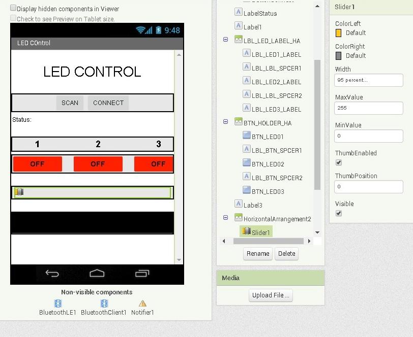 एआईए फ़ाइल सहित इस एप्लिकेशन को बनाने पर पूर्ण विवरण http://www.martyncurrey.com/arduino-hm-10-and-app-inventor-2-adding-a-slider/ पर उपलब्ध हैं