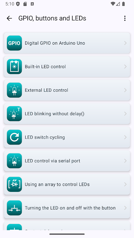 ऐप में Arduino के साथ उपयोग किए जाने वाले इलेक्ट्रॉनिक घटकों, एनालॉग और डिजिटल सेंसर और बाहरी मॉड्यूल का एक विस्तृत संग्रह शामिल है। प्रत्येक आइटम के साथ ये चीजें मिलती हैं: