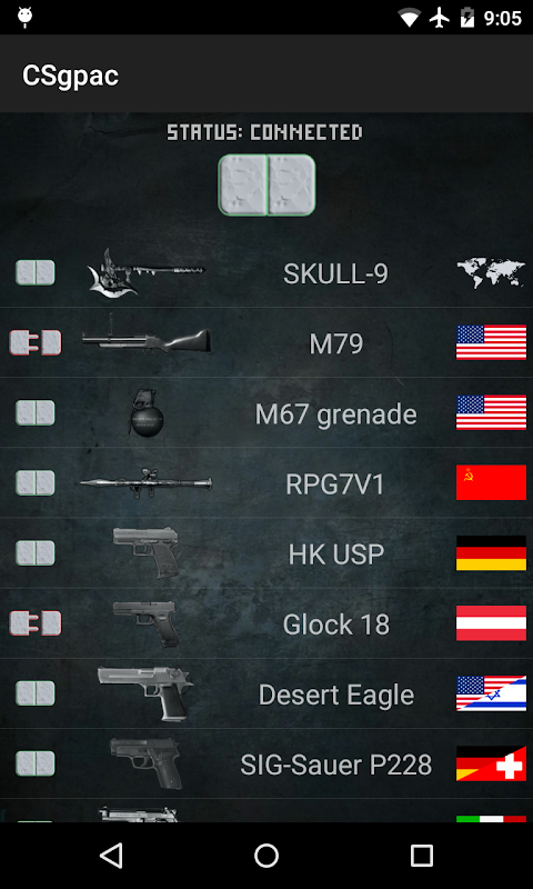 When app start just tap on icon above a textview of status to connect all guns to Armed Cam. Then if you want to exclude some weapon tap on it otherwise tap to connect. When Gun Pack is connected it not appear in applications menu of device. To access app you can start it directly from Armed Cam in "weapon map" menu.