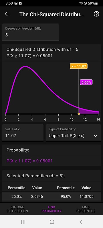पी-मानों की गणना के लिए या अलग-अलग वितरण के साथ काम करते समय संभावनाएं या प्रतिशत (दो-पूंछ, ऊपरी पूंछ या निचला पूंछ) ढूंढें। आत्मविश्वास अंतराल के लिए महत्वपूर्ण मान प्राप्त करें। अपेक्षित मान और मानक विचलन प्रदर्शित करें, और यादृच्छिक संख्याओं का अनुकरण करें।