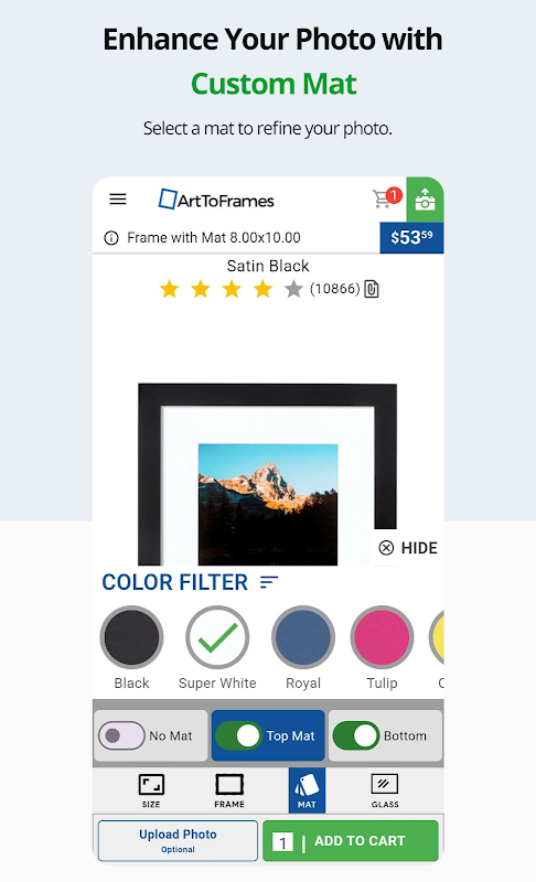 स्मार्ट विज़ुअलाइज़र: अपनी कलाकृति या फ़ोटो अपलोड करें और देखें कि वास्तविक समय में विभिन्न फ़्रेम कैसे दिखते हैं। खरीदने से पहले सही संयोजन खोजने के लिए फ़्रेम आकार, मैटिंग विकल्प और बहुत कुछ समायोजित करें।