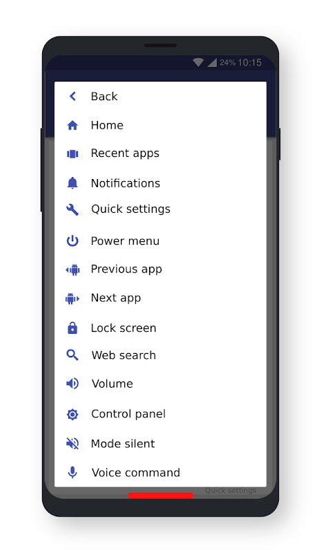 ऐप आपकी स्क्रीन के निचले हिस्से में एक सॉफ्टवेयर बटन बनाता है और इस बटन में कई क्रियाओं को जोड़ता है।