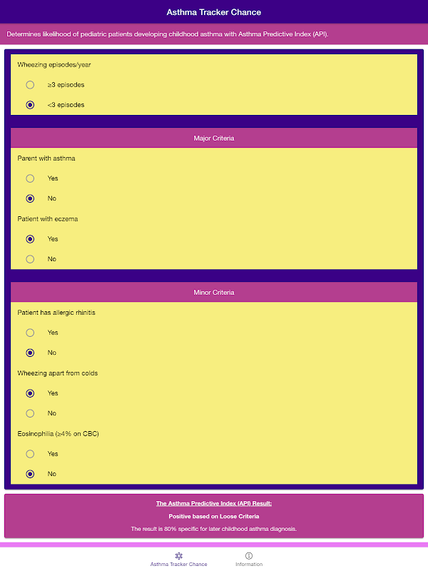 "अस्थमा ट्रैकर चांस - अस्थमा प्रीडिक्टिव इंडेक्स" 3 साल से कम उम्र के रोगियों पर बचपन के अस्थमा के विकास की संभावना निर्धारित करने के लिए स्वास्थ्य चिकित्सक या बाल रोग विशेषज्ञ की मदद करने के लिए डिज़ाइन किया गया एक मेडिकल मोबाइल ऐप है। "अस्थमा ट्रैकर चांस - अस्थमा प्रिडिक्टिव इंडेक्स" ऐप सख्त मापदंड और ढीले मापदंड दोनों पर आधारित है। अस्थमा पूर्वसूचक सूचकांक के लिए सख्त मापदंड का उपयोग प्रति वर्ष 3 से अधिक घरघराहट वाले बच्चों के लिए किया जाएगा। जबकि ढीले मापदंड का उपयोग 3 से कम प्रति वर्ष के घरघराहट वाले बच्चों के लिए किया जाएगा।