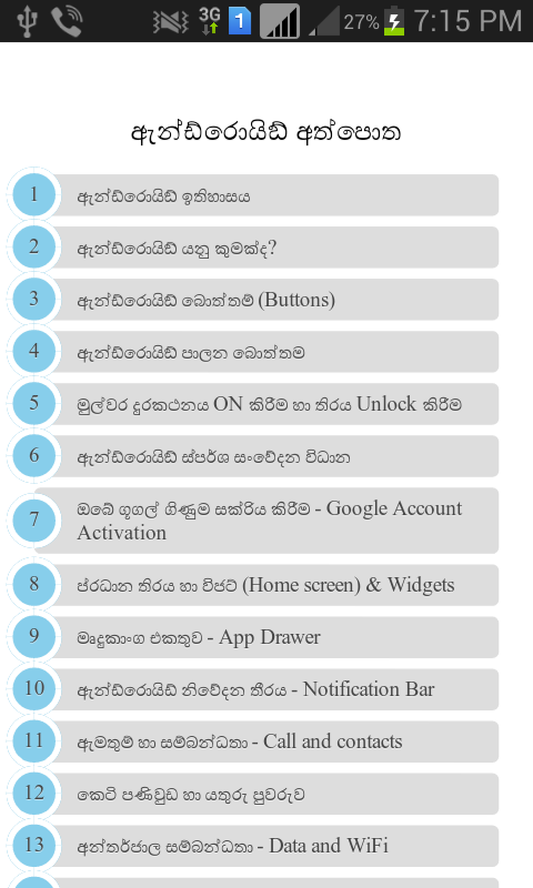 This app is totally constructed as an Android Sinhala guide book or you can call it as an "Android Manual" which comes in Sinhala language. Starts with a little introduction about what android really is, this app guide you through from first power on of your android device, to each and every section of android world. With descriptive content and suitable images, you can be familiar with your android device very quickly. From the indexed main menu, you can jump to any section of the guide you want. We hope this app will empower novice users about how to use their android handsets to its full potential.