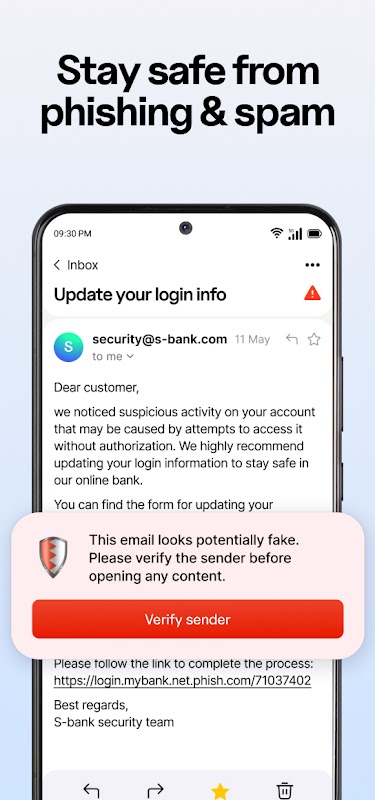 • स्पैम मुक्त - एक साफ़, शांत इनबॉक्स के लिए अंतर्निहित AI स्पैम और फ़िशिंग सुरक्षा।