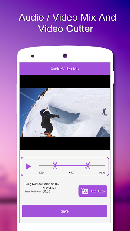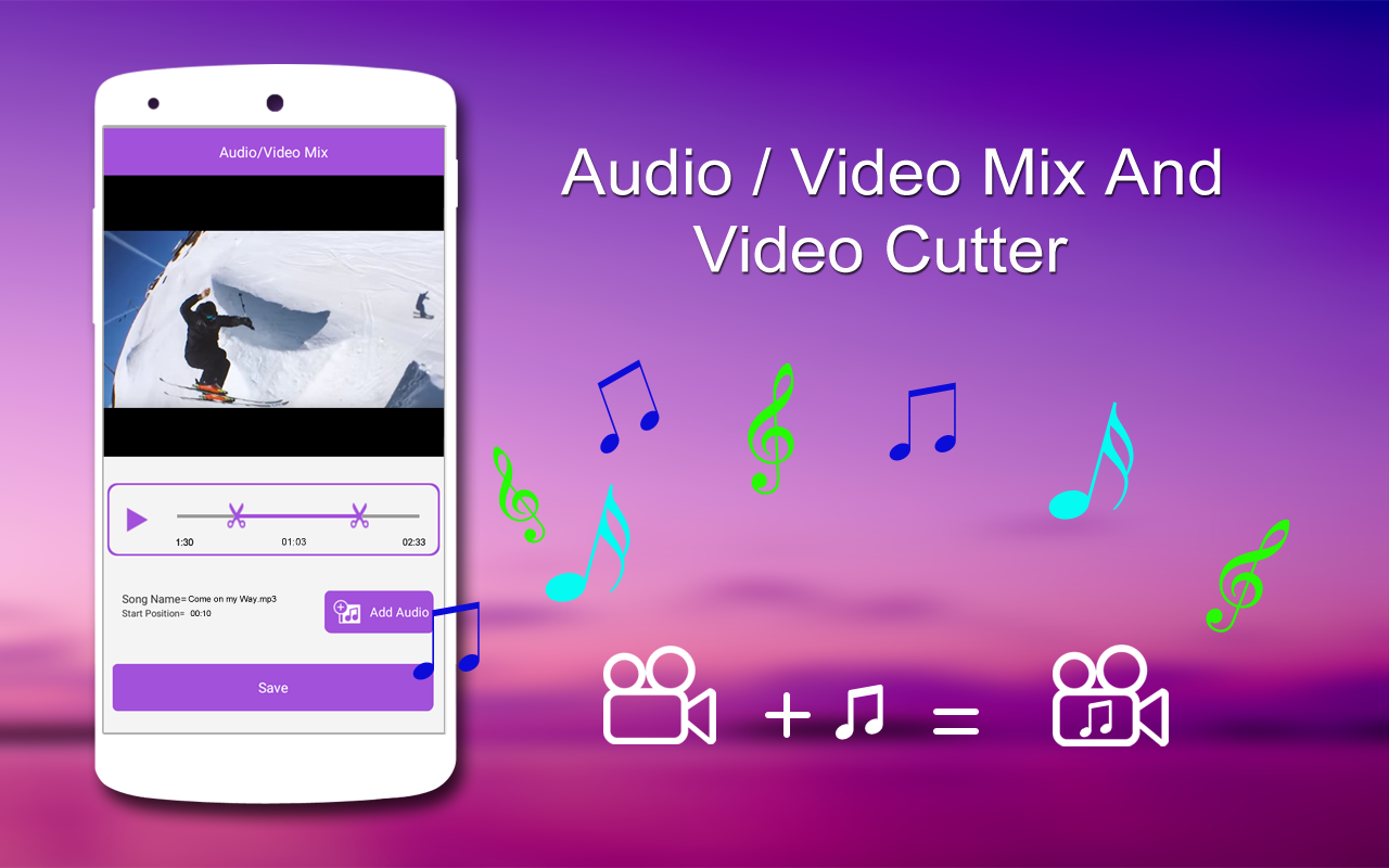 ऑडियो / वीडियो मिक्स, वीडियो कटर, एक वीडियो की पृष्ठभूमि संगीत को बदलने के लिए प्रयोग करने में आसान और स्वतंत्र अनुप्रयोग है