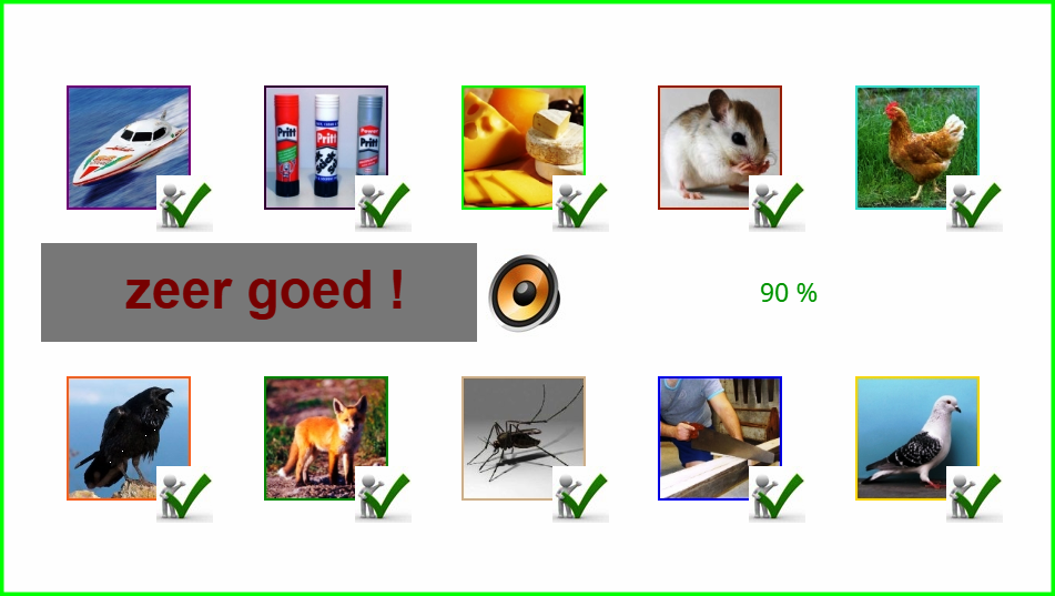 इस नमूना भाषा अभ्यास 'श्रवण संश्लेषण' में प्रत्येक 10 शब्दों के साथ 1 श्रृंखला है (पूर्ण संस्करण में 10 श्रृंखलाएं हैं, इसलिए 100 शब्द)। सबसे पहले अपनी सीरीज चुनें। स्पीकर पर क्लिक करें (1 या अधिक बार)। खोजा जाने वाला शब्द व्यक्तिगत अक्षरों के साथ ध्वन्यात्मक रूप से उच्चारित किया जाता है। खोजे जाने वाले शब्द का उच्चारण ज़ोर से करने का प्रयास करें और मेल खाने वाले चित्र पर क्लिक करें। यदि कोई त्रुटि है, तो आपको एक त्रुटि संदेश सुनाई देगा। एक सही उत्तर के साथ आप शब्द सुनते हैं। इस तरह 10 शब्द करें। अंत में आपको अपना परिणाम (%) दिखाई देगा। हेडफोन आवाज को और भी बेहतर बनाते हैं। टैबलेट पर सबसे अच्छा काम करता है।
