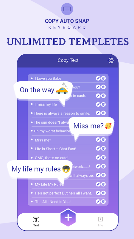 यह एक निःशुल्क कस्टम कीबोर्ड ऐप है जो उपयोगकर्ताओं को कॉपी और पेस्ट करने के लिए किसी अन्य स्थान पर स्विच किए बिना सीधे अपने कीबोर्ड से टेम्प्लेट टेक्स्ट को आसानी से भरने में मदद करता है।