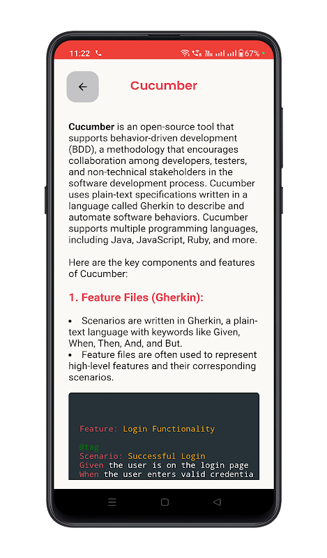 यह ऐप स्वचालन परीक्षण के प्रमुख पहलुओं को संबोधित करते हुए मॉड्यूल में विभाजित एक संरचित पाठ्यक्रम को शामिल करता है। सॉफ़्टवेयर परीक्षण के बुनियादी सिद्धांतों से लेकर मोबाइल एप्लिकेशन ऑटोमेशन तक, आप सेलेनियम, मोचा और एपियम जैसे उद्योग-मानक टूल का उपयोग करके व्यावहारिक कौशल हासिल करेंगे।
