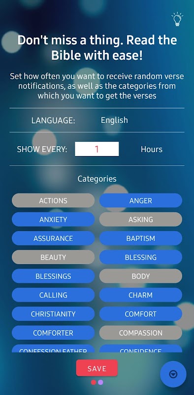 यादृच्छिक बाइबिल छंदों को शेड्यूल करके आसानी से बाइबिल पढ़ें। एक श्लोक एक दिन।