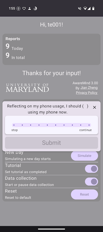 यह एप्लिकेशन, अवेयरमाइंड, अपने डेवलपर द्वारा किए गए शोध के समर्थन में डेटा संग्रह के लिए डिज़ाइन किया गया है। जब तक आपको डेवलपर से सीधा संचार प्राप्त न हो, कृपया इस एप्लिकेशन को इंस्टॉल न करें।