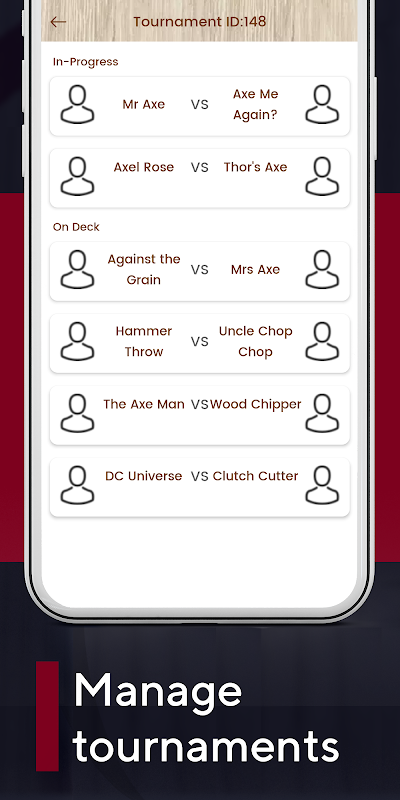 हमारे कुल्हाड़ी टूर्नामेंट प्रणाली के साथ 64 खिलाड़ियों के साथ मेजबान कुल्हाड़ी फेंकने वाले टूर्नामेंट।