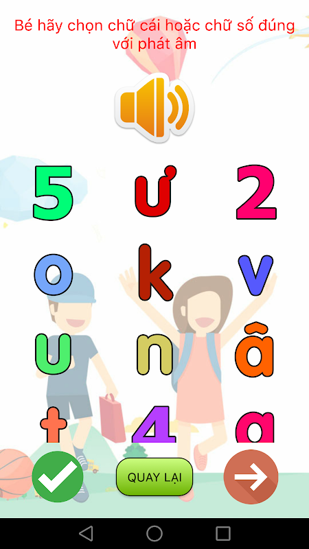 - Nghe âm đoán chữ: Bé nghe phát âm và tìm đúng chữ cái, chữ số