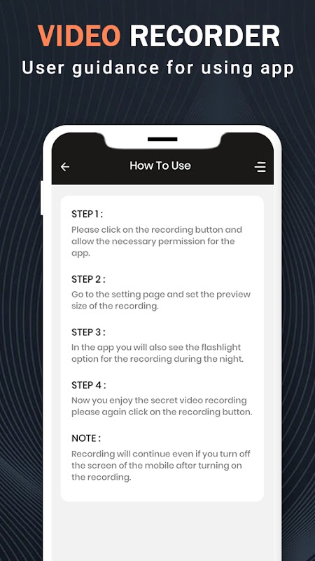 Screen Off video recorder is a best off screen camera recorder. This off screen video recording app has Automatic Recording Video in the background even when the screen is off. Screen Off video recorder app records video even mobile screen Off. Screen off video recorder app will stop a recording when it reaches storage capacity. You can schedule the timer to record video in the screen off camera app. Screen off camera is a video background app which records video while your screen is off.