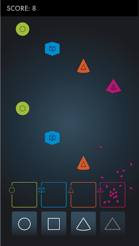 In the game you will find 4 objects, pyramid, cone, cube and a cricle. When you click play the game will start and objects will start falling from above. For every object there is a matching frame. When the object enters the frame a matching button must be clicked. So if pyramid enters a pyramid frame you must click on the pyramid button. Remember that button positions will shift and the movement speed of objects will increase. The goal is to reach the biggest score possible.