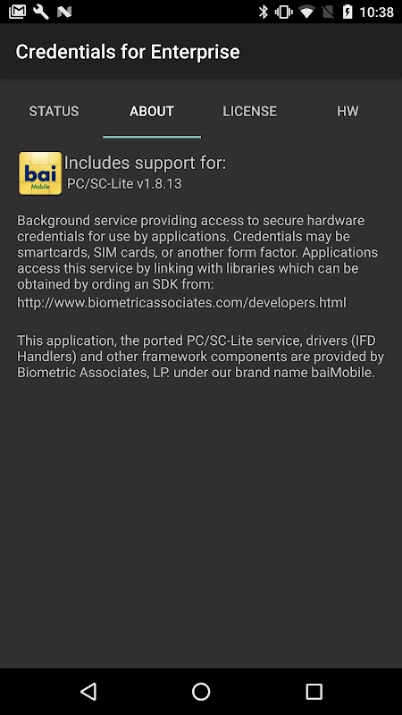 बाईमोबाइल® क्रेडेंशियल्स फॉर एंटरप्राइज (क्रेडेंशियल्स 4ई) ऐप एक पृष्ठभूमि सेवा है जो विभिन्न पाठक विक्रेताओं से विभिन्न प्रकार के स्मार्टकार्ड पाठकों के लिए सहायता प्रदान करती है। क्रेडेंशियल्स 4ई उन अनुप्रयोगों द्वारा लीवरेज किया जाता है जो क्रेडेंशियल सर्विसेज (एसडीके पुस्तकालयों का एक सेट) के लिए बाईमोबाइल® फ्रेमवर्क को एम्बेड करते हैं। क्रेडेंशियल सेवाओं के लिए baiMobile® फ्रेमवर्क को एम्बेड करने वाले Android ऐप्स की सूची के लिए, कृपया हमारी वेबसाइट http://www.baiMobile पर जाएं या हमें [email protected] या [email protected] पर ईमेल करें। ऐसे ऐप्स को स्मार्टकार्ड पर संग्रहीत कुंजियों और डिजिटल प्रमाणपत्रों तक पहुंचने के लिए क्रेडेंशियल 4E स्थापित और चालू होना चाहिए।