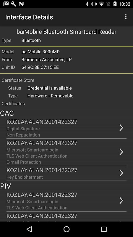 (१) क्रेडेंशियल्स ४ई समर्थित कार्डों से सभी उपलब्ध प्रमाणपत्रों को पढ़ने और प्रदर्शित करने के लिए स्क्रीन प्रदान करता है। इसे पूरा करने के लिए, क्रेडेंशियल 4E क्रेडेंशियल सर्विसेज एसडीके के लिए बाईमोबाइल® फ्रेमवर्क का उपयोग करता है, जैसा कि कोई अन्य एप्लिकेशन कर सकता है। यह आपको आपके कार्ड प्रकार के समर्थन के लिए क्रेडेंशियल सर्विसेज SDK के लिए baiMobile® फ्रेमवर्क की जांच करने का एक तरीका प्रदान करता है।