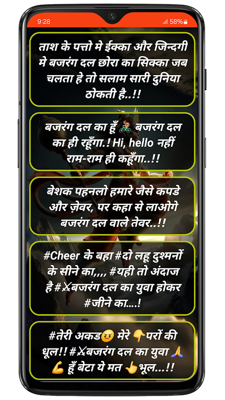 इंटरफ़ेस का उपयोग करना बहुत आसान है, हिंदी में सर्वश्रेष्ठ लाइव बजरंग दल रवैया स्थिति पढ़ने के लिए बस ऊपर से नीचे की ओर स्वाइप करें और इसे आसानी से अपने हिंदी व्हाट्सएप स्टेटस या एफबी बजरंग दल स्टेटस के रूप में सेट करें।