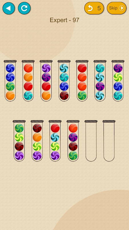 • नियम यह है कि आप केवल एक गेंद को दूसरे के ऊपर ले जा सकते हैं यदि दोनों एक ही रंग की हों और जिस ट्यूब में आप ले जाना चाहते हैं उसमें पर्याप्त जगह हो.
