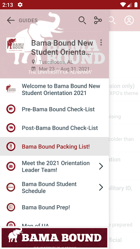 बामा बन्धे उपयोगकर्ताओं ऐसे बामा बाध्य नई छात्र अभिविन्यास, विश्वविद्यालय के दिनों, और स्वीट होम Capstone बस कुछ ही नाम के रूप में की घटनाओं के बारे में जानकारी का उपयोग करने की अनुमति देता है कि आपके फोन या टैबलेट के लिए एक सभी में एक app है.