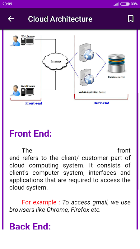 क्लाउड कंप्यूटिंग एक उभरती हुई तकनीक है जिसका उपयोग संगठनों द्वारा पैसे बचाने के लिए कई विभिन्न तरीकों से किया जाता है। हम में से हर कोई जो कंप्यूटर का उपयोग कर रहा है उसे इस तकनीक के बारे में पता होना चाहिए। क्लाउड सेवाएं अन्य सेवाओं की तुलना में बहुत कम खर्चीली हैं। यह ऐप उपयोगकर्ताओं को क्लाउड कंप्यूटिंग की बुनियादी अवधारणाओं को समझने की अनुमति देने के लिए सरल भाषा का उपयोग करता है।