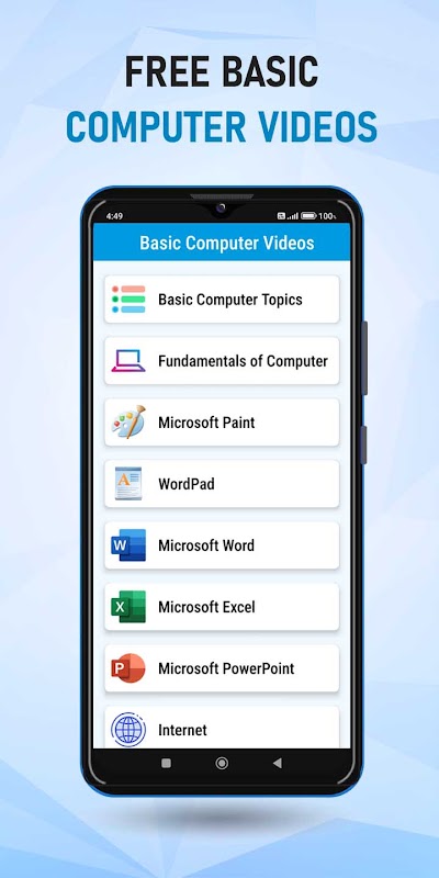 हमारा ऐप इंस्टॉल करने के बाद आप वीडियो और पीडीएफ नोट्स के साथ पूर्ण बुनियादी कंप्यूटर पाठ्यक्रम सीखने में सक्षम हैं।