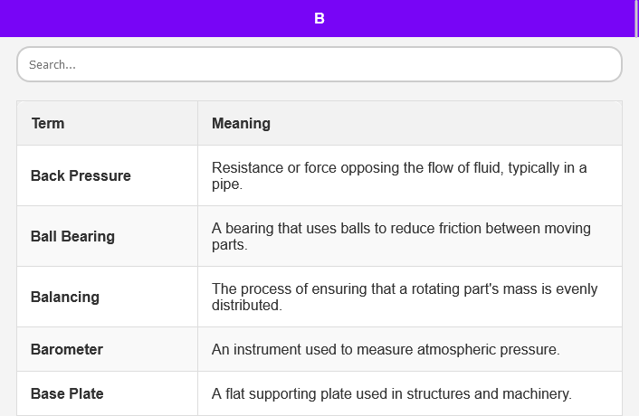 ए-जेड संगठन: सभी शब्दों को सावधानीपूर्वक ए से जेड तक वर्गीकृत किया गया है, जिससे नई इंजीनियरिंग शब्दावली को ब्राउज़ करना और खोजना आसान हो गया है। वर्णानुक्रमिक संगठन आपको बिना किसी परेशानी के शब्दों का पता लगाने में मदद करता है।