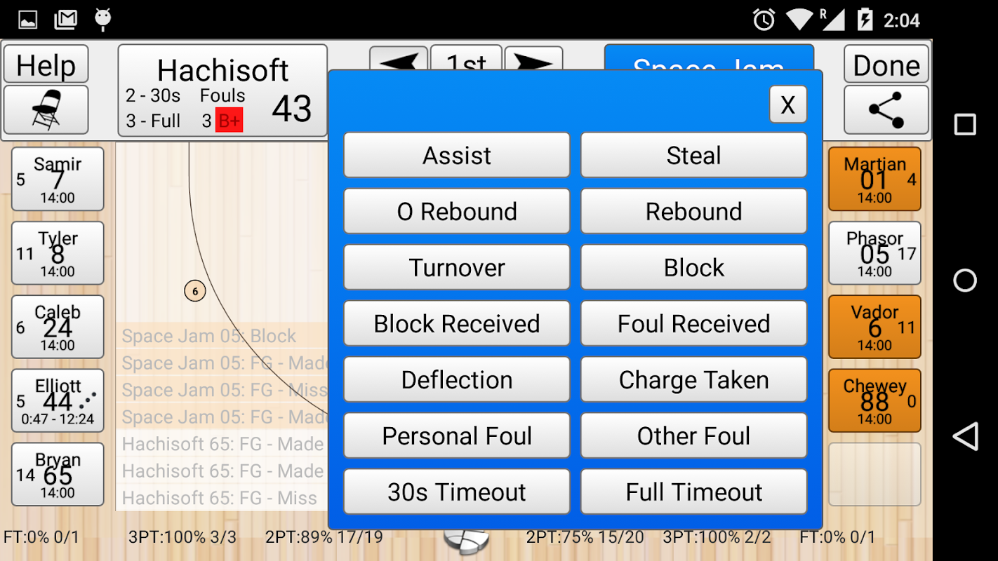 - Trackable आँकड़े: rebounds, सहायता, ब्लॉक, चुरा रहा है, विक्षेपण, turnovers के लिया प्रभार, फ़ाउल प्राप्त किया, फ़ाउल प्रतिबद्ध, संपत्ति, और अधिक।