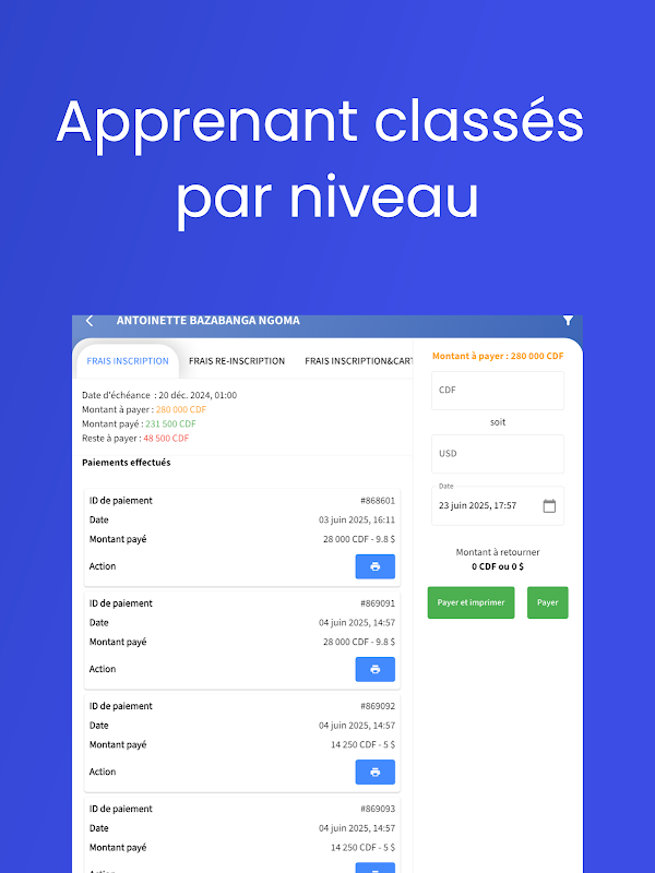 • 🖨️ थर्मल प्रिंटर या पारंपरिक प्रिंटर (आपके डिवाइस की क्षमताओं के आधार पर) के माध्यम से भुगतान प्रिंट करें। • 📊 डैशबोर्ड पर वास्तविक समय के आँकड़ों के साथ स्कूल का अवलोकन (एकत्र की गई राशि, देय राशि, छात्रों की अप-टू-डेट संख्या, आदि)।