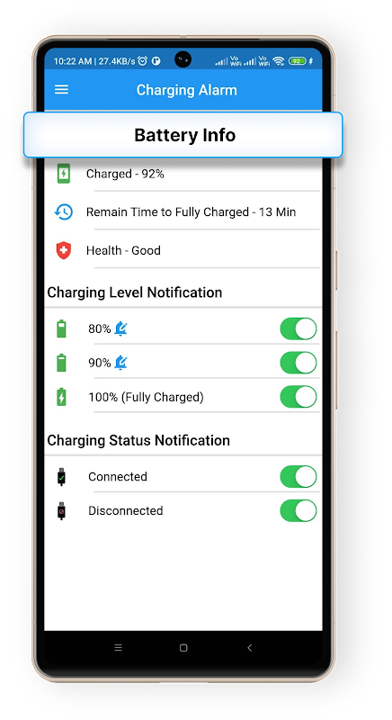 # अपने फोन को चार्जिंग पर बिना देखे छोड़ने की चिंता न करें! जब आपके फोन की बैटरी पूरी तरह चार्ज होने वाली होगी, तो फुल बैटरी और चार्जिंग अलार्म एक आवाज की घोषणा करेगा.