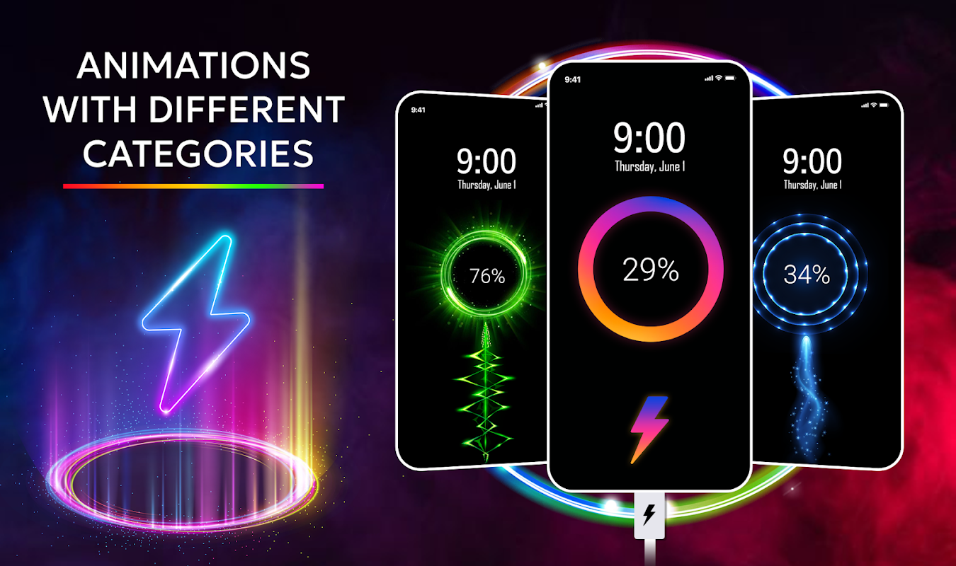 यह एक सुंदर चार्जिंग एनिमेटेड स्क्रीन बनाने के लिए एक त्वरित और सरल समाधान प्रदान करता है जिसमें बैटरी चार्जिंग प्रस्तुति भी शामिल है। होम स्क्रीन और मोबाइल लॉक स्क्रीन पर आप अपने फोन की स्क्रीन का बैटरी लेवल आसानी से देख सकते हैं।