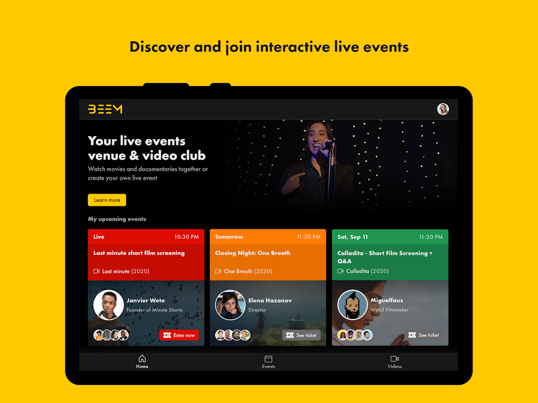Beem प्रीमियम वीडियो के लिए पहला सोशल नेटवर्क है, जो उपयोगकर्ताओं को एक अद्वितीय काउच अनुभव में फिल्मों और वृत्तचित्रों को एक साथ देखने की अनुमति देता है, अपने समुदायों द्वारा सुझाए गए नए शीर्षक, खोज, किराए पर लेने और खरीदने और अपने जुनून को साझा करने और पृष्ठों के माध्यम से अनुयायियों के साथ जुड़ने के दौरान अपने जुनून को मोनेटाइज करने के लिए बनाता है। और क्यूरेट करें। सभी प्रमुख स्टूडियो और स्वतंत्र वितरकों के साथ हमारी मजबूत व्यापारिक भागीदारी और लाइसेंसिंग समझौते हमें हमारे समुदाय को प्रीमियम फिल्मों और वृत्तचित्रों की एक विशाल सूची प्रदान करने की अनुमति देते हैं, जिसमें नवीनतम नई रिलीज़ से लेकर लोकप्रिय या आला क्लासिक्स शामिल हैं।