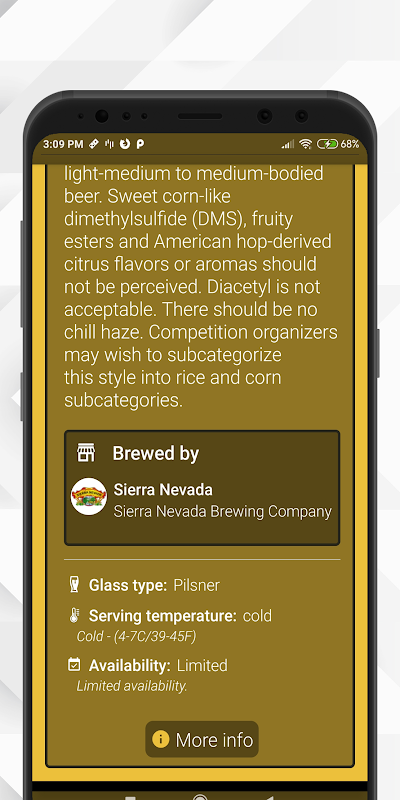 * कुछ बियर के लिए उपलब्ध अतिरिक्त जानकारी (जैसे कि फूड पेयरिंग, ग्लास टाइप, सर्विंग टेम्परेचर और भी बहुत कुछ)