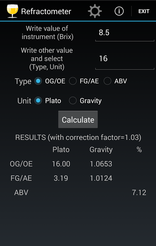 एप्लिकेशन को कुछ अलग और स्वतंत्र वर्गों, अलग अलग गणना, विशेष रूप से रंग, कड़वाहट के विषय में हर एक, और शक्ति (गुरुत्वाकर्षण और अटल बिहारी वाजपेयी) हाइड्रोमीटर और refractometer का उपयोग कर के होते हैं। हर खंड इसके स्वयं सहायता पृष्ठ और विभिन्न कार्यों का स्पष्टीकरण दिया है।