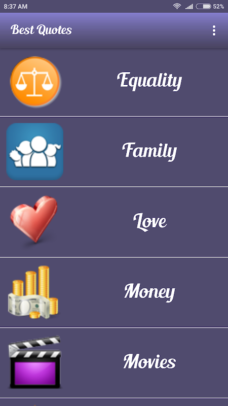 This app contains numerous quotes of various topics. Topics include Age, Anger, beauty, Business, Change, Children, Courage......etc.