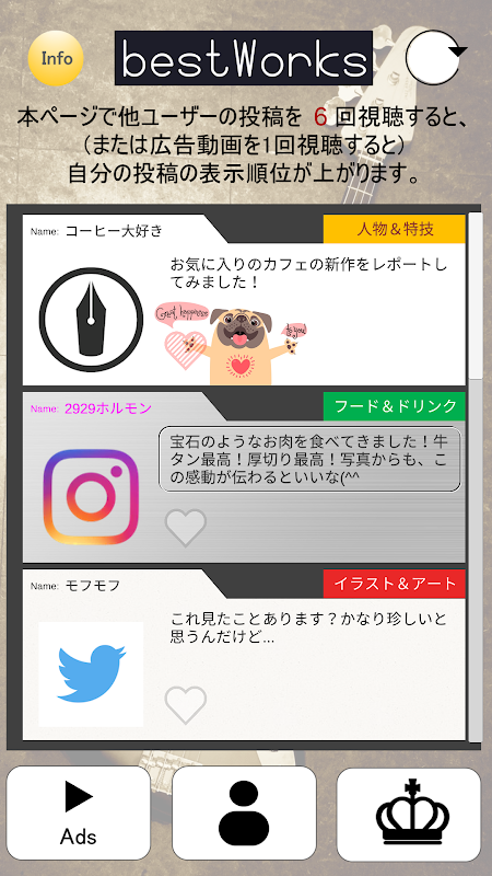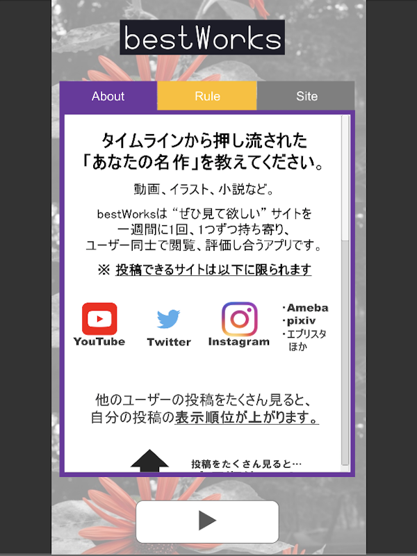 bestWorksは“ぜひ見て欲しい”サイトを、一週間に1回、1つずつ持ち寄り、ユーザー同士で閲覧、評価し合うアプリです。