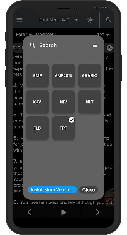 123+ तक के कई बाइबिल संस्करणों के साथ, जिनमें द पैशन ट्रांसलेशन (टीपीटी), द लिविंग बाइबल (टीएलबी), किंग जेम्स वर्जन (केजेवी), अमेरिकन स्टैंडर्ड वर्जन (एएसवी), न्यू इंटरनेशनल वर्जन (एनआईवी), न्यू किंग जेम्स वर्जन ( एनकेजेवी), और भी बहुत कुछ, आप कभी भी, कहीं भी बाइबल पढ़ सकते हैं, अध्ययन कर सकते हैं और खोज सकते हैं।