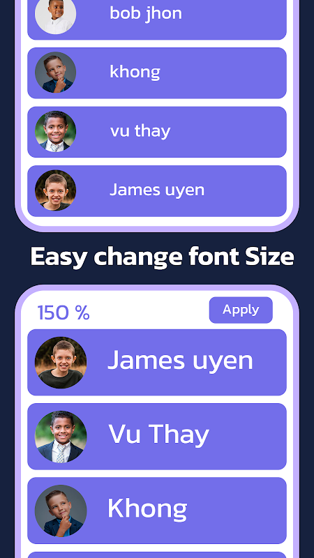 फ़ॉन्ट आकार बदलें और डिस्प्ले आकार बड़ा करें, सभी लोगों को सभी एंड्रॉइड डिवाइसों में टेक्स्ट को अधिक आसानी से और तेज़ी से पढ़ने में मदद करने के लिए एक निःशुल्क बड़ा फ़ॉन्ट एप्लिकेशन विकसित किया गया है।