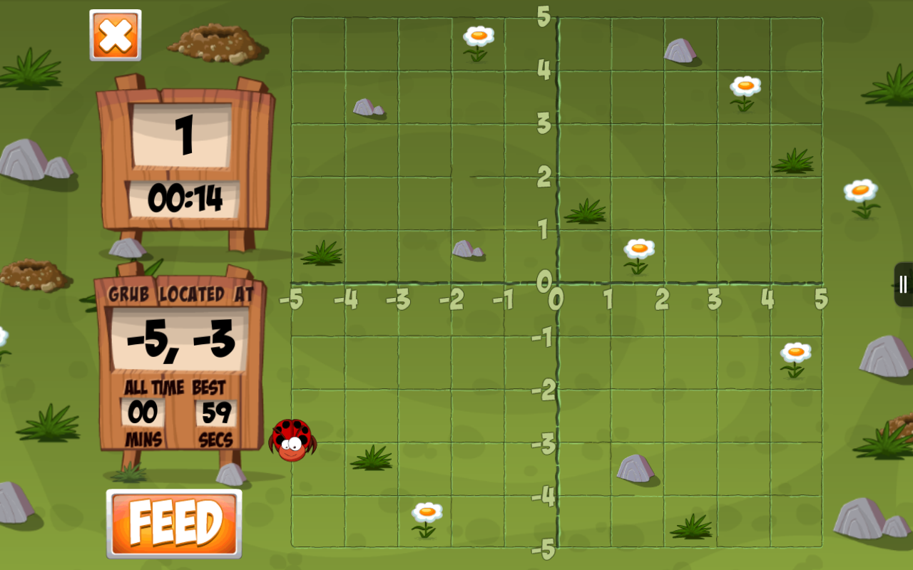 Billy Bug and his Quest for Grub is designed to help children learn how to use coordinates in a fun and engaging way. Make short swipes on the screen to move Billy to the given coordinates. Billy is a greedy little bug and will need to be fed ten times! How quickly can you feed Billy?