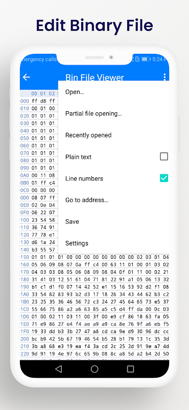 07. हेक्साडेसिमल संपादक: ऐप के भीतर से सीधे बाइनरी फाइलों को संपादित करें। विशिष्ट बाइट्स में परिवर्तन करें, डेटा सम्मिलित करें या हटाएं, और संशोधित फ़ाइल को आगे के विश्लेषण या उपयोग के लिए सहेजें।