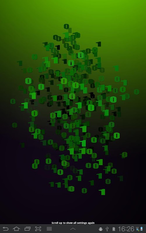 A tree with ones and zeros as leaves. Branches sway slowly and the tree spins smoothly around it's own axis as you scroll between home screens. Tree branches die after a while and fade away, and a new branch is born, growing up from the trunk led by a glowing cursor. As the branch is fully grown it explodes in a light flash and leaves a new 1 or 0 as the leaf.