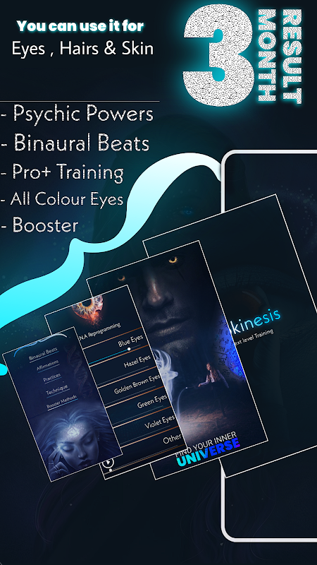 हमने बहुत अधिक शोध किया है और आपके लिए उच्च गुणवत्ता वाले आवृत्तियों का निर्माण किया है। जो आपको कहीं और नहीं मिलेगा। इन बीनायुरल बीट्स (मस्तिष्क की तरंगों) से आप 3 महीने के भीतर अपनी आंखों, त्वचा और बालों का रंग बदल सकते हैं। यह सुरक्षित रूप से आपके D.N.A को फटकार लगाएगा। इस एप्लिकेशन में, हमने हर एक विवरण का पूरा पैकेज दिया है जो आपकी बहुत मदद करेगा। ये धड़कनें आपकी बायोकाइनिस क्षमता और सभी आँखों के रंगों पर प्रभावी होती हैं जैसे: - नीली आँखें, हरी आँखें, हेज़ल आँखें, लाल आँखें, बैंगनी आँखें, सुनहरी भूरी आँखें और अन्य।