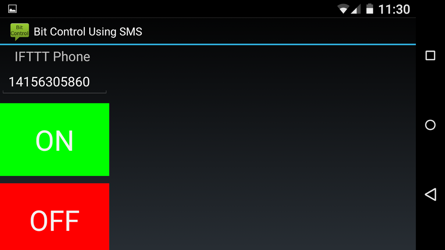 Bit Control gives simple ON and OFF control for a littleBits cloudBit type output. It uses SMS Text messages and the If This Than That IFTTT website or IF app. Bit Control sends a #1 tagged message when you press the ON and a #0 tagged message when you press OFF. You can also change the IFTTT phone number if you need to. These tagged messages can be programmed to turn ON and OFF the littleBit output or do other cool stuff.