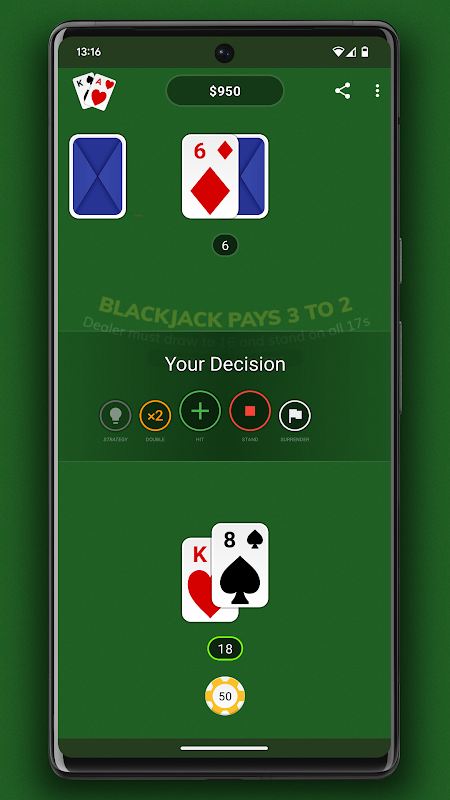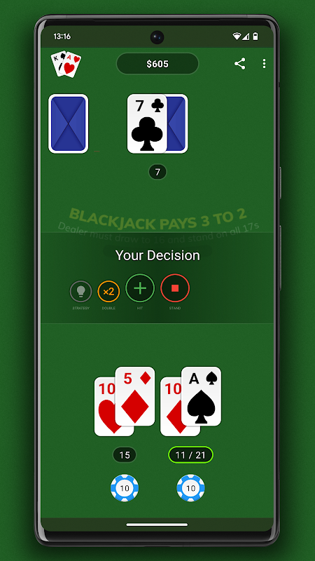 • असली पैसे के इस्तेमाल के बिना ब्लैकजैक खेलें