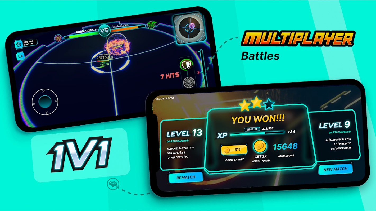 इस 1v1 मल्टीप्लेयर लड़ाई में शामिल हों और अपने दोस्तों या दुनिया भर के खिलाड़ियों के साथ खेलें!
