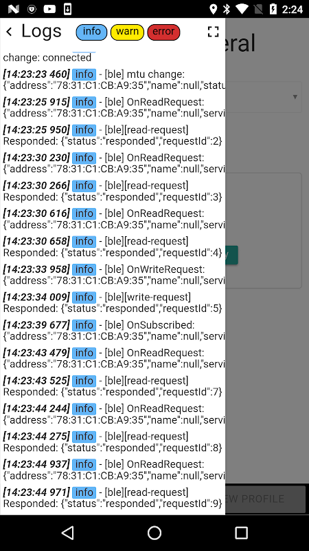 यह एक Android एप्लिकेशन है डेवलपर एक BLE परिधीय सिम्युलेटर कॉन्फ़िगर अनुमति देते हैं। आवेदन कई परिधीय सिमुलेटर प्रोफ़ाइल अनुमति देते हैं। संभावना अनुकूलन विशेषता के हैंडलर, इस का निर्माण करने के लिए पर्याप्त जटिलता सिम्युलेटर अपने सॉफ़्टवेयर की सेवा आप में मदद मिलेगी।