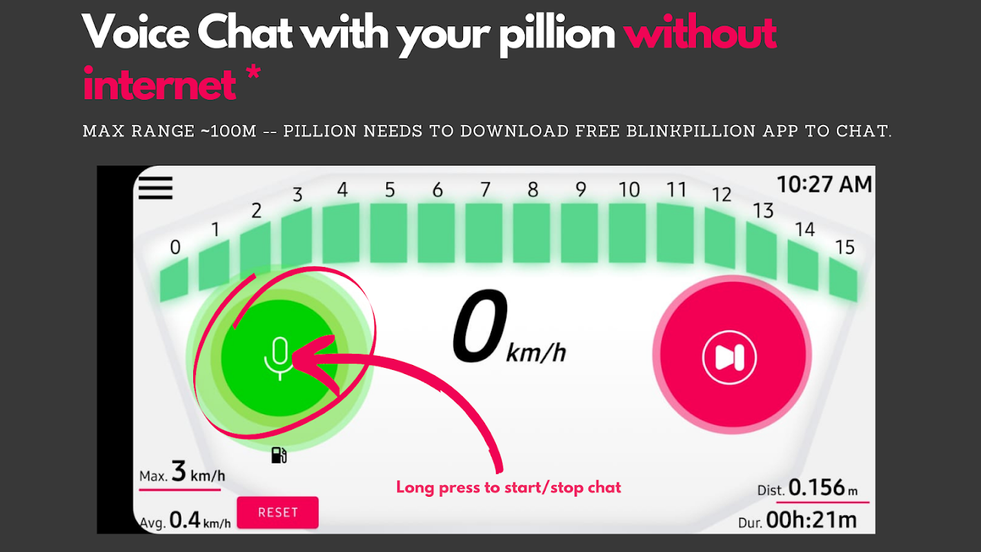 मोटरसाइकिलों के लिए, ब्लिंकडैश में इनबिल्ट ब्लूटूथ इंटरकॉम है जो बिना इंटरनेट के काम करता है जिससे आप अपने बिलियन के साथ चैट कर सकते हैं। महंगे इंटरकॉम डिवाइस जैसे सैना या कार्डो खरीदने की जरूरत नहीं है। कोई भी ब्लूटूथ हेलमेट या नियमित हेडफ़ोन प्राप्त करें और आपका जाना अच्छा है। & nbsp;