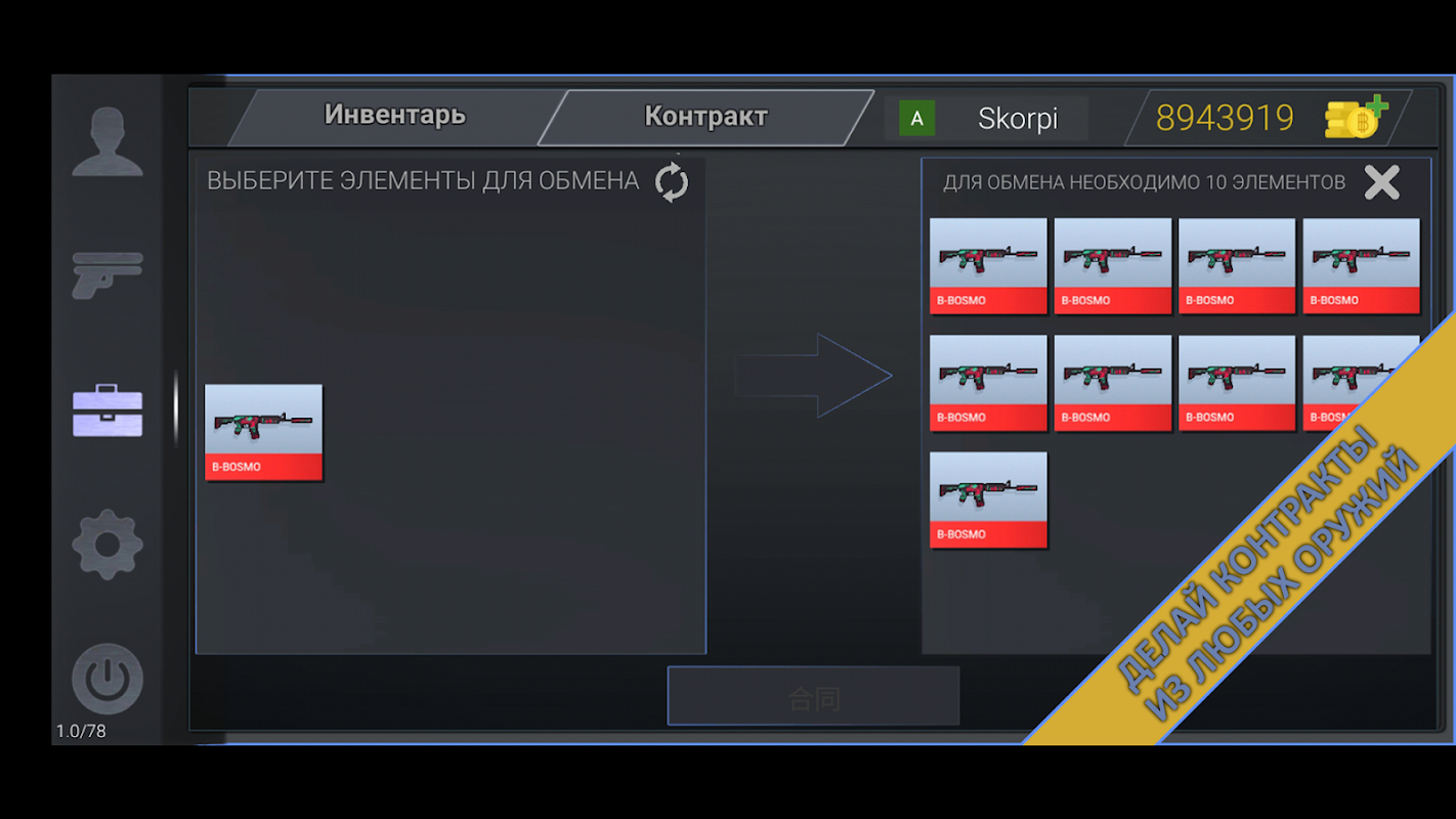 खेल में, आप मामले खोल सकते हैं, हथियार खरीद और बेच सकते हैं, और अनुबंधों में प्रवेश कर सकते हैं, नए के लिए पुराने हथियारों का आदान-प्रदान कर सकते हैं।